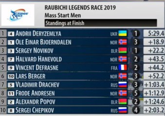 Андрей Дериземля на 18,9 секунды опередил легендарного норвежца, 45-летнего Уле Эйнара Бьорндалена. Третье место занял 39-летний белорус Сергей Новиков.