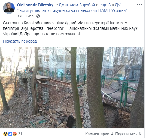 Сегодня, 19 февраля, на территории Института педиатрии, акушерства и гинекологии Национальной академии медицинских наук Украины по адресу ул. Платона Майбороди, 8 обвалился пешеходный мост. Об этом сообщил Александр Билетский в Facebook.