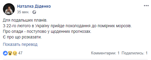 Как написала Диденко, 22 февраля гражданам страны стоит отвыкнуть от тепла и приготовиться к похолоданию и умеренным морозам. Также синоптик отметила, что информация по поводу осадков будет сообщаться "постепенно в ежедневных прогнозах", добавив, что ей "есть о чем рассказать".