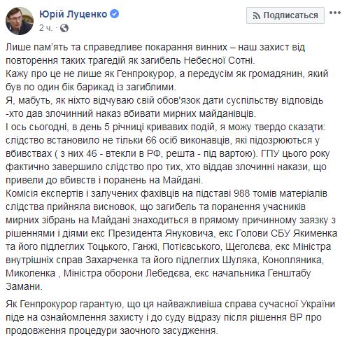 Из 66 исполнителей, которые подозреваются украинским следствием в убийствах активистов на Майдане, 46 сбежали в РФ, остальные - под стражей. Об этом 20 февраля, в пятую годовщину гибели Небесной сотни. Об этом написал в Facebook генеральный прокурор Юрий Луценко.