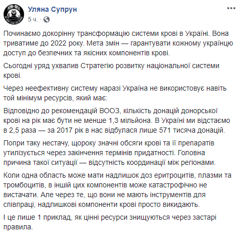 Правительство приняло Стратегию развития национальной системы крови, согласно которой в стране начнется коренная трансформация системы крови. Трансформация будет продолжаться до 2022 года и будет зависеть от добровольной сдачи донорской крови. Об этом сообщила и.о. министра здравоохранения Ульяна Супрун на своей странице в Facebook.