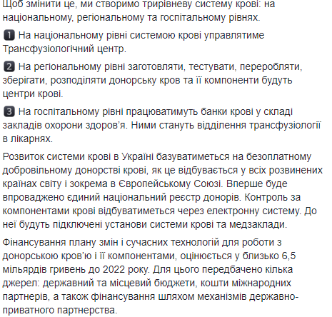 Развитие системы крови в Украине будет базироваться на добровольном безвозмездном донорстве крови, как это происходит во всех развитых странах мира и в частности в Европейском Союзе. Будет введен единый национальный регистр доноров. Контроль за компонентами крови будет происходить через электронную систему. К ней будут подключены учреждения системы крови и медучреждения.