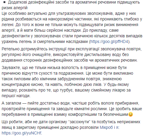 "Желательная относительная влажность в помещении - 40-60%. При более высоких значениях может возрастать риск развития грибков, при более низкой - развиваются перечисленные выше симптомы", - пишет чиновница в Facebook.