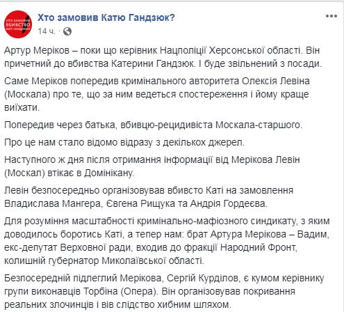 Активисты группы "Кто заказал Катю Гандзюк?" заявили, что к убийству советника мэра Херсона причастен действующий руководитель Нацполиции Херсонской области Артур Мериков. Об этом группа написала на своей странице в Facebook.