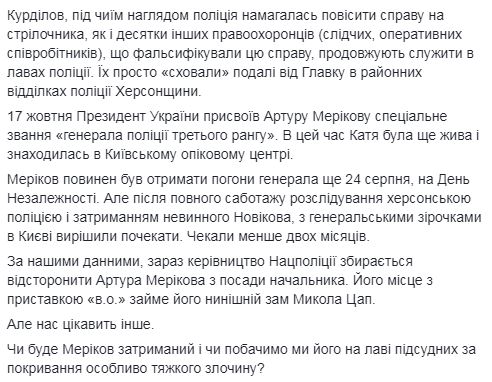 "Но после полного саботажа расследования херсонской полицией и задержанием невиновного Новикова, с генеральскими звездочками в Киеве решили подождать. Ждали менее двух месяцев", - отметили активисты. "Но нас интересует другое. Будет Мериков задержан и увидим ли мы его на скамье подсудимых за покрытие особо тяжкого преступления? ", - резюмируется в сообщении.