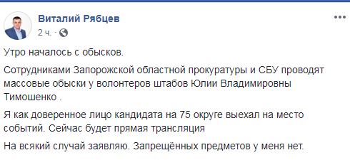 Он отмечает, что следственные действия проходят не по одному адресу, а проходят "массовые обыски у волонтеров штаба". "Утро началось с обысков. Сотрудники Запорожской областной прокуратуры и СБУ проводят массовые обыски у волонтеров штабов Юлии Владимировны Тимошенко", - написал Рябцев.