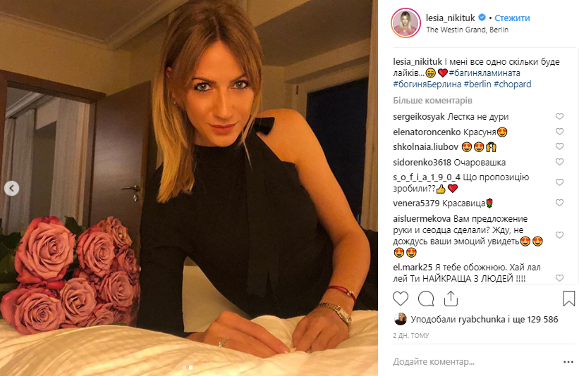 В соцсети появилось интригующее фото популярной украинской телеведущей Леси Никитюк, на котором она позирует перед фотокамерой в черном вечернем платье с букетом роз и самой важной, хотя и менее всего бросающейся в глаза деталью - на безымянном пальце правой руки телезвезды поблескивает кольцо.