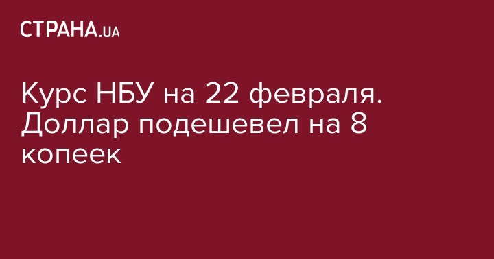 Национальный банк Украины (НБУ) на 22 февраля 2019 года установил официальный курс доллара на уровне 27,00 грн/доллар, что на 8 копеек ниже по сравнению с предыдущим банковским днем. Об этом передает пресс-служба НБУ.
