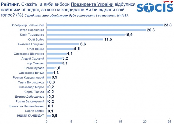 Среди тех, кто обязательно будет голосовать и определился с выбором, 23,8% опрошенных отдали бы голоса за Владимира Зеленского, 20,3% – за Петра Порошенко, 15,9% – за Юлию Тимошенко, 11,5% – за Юрия Бойко, 6,6% – за Анатолия Гриценко, 5,5% – за Олега Ляшко.