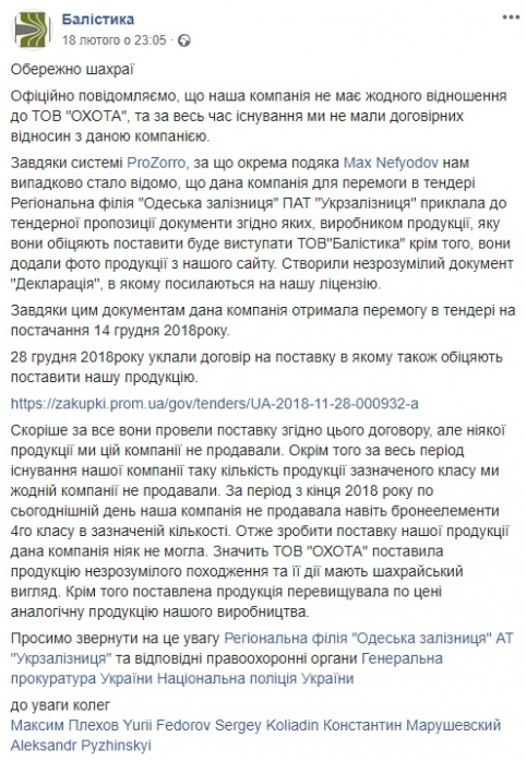 Однако 18 февраля на своей странице в Facebook ООО "Баллистика" заявило, что никакого отношения к фирме-победителю тендера не имеет. Кроме этого "Баллистика" утверждает, что за весь период существования компании такое количество бронежилетов указанного класса, они никому не продавали, а предлагаемая стоимость продукции существенно завышена.