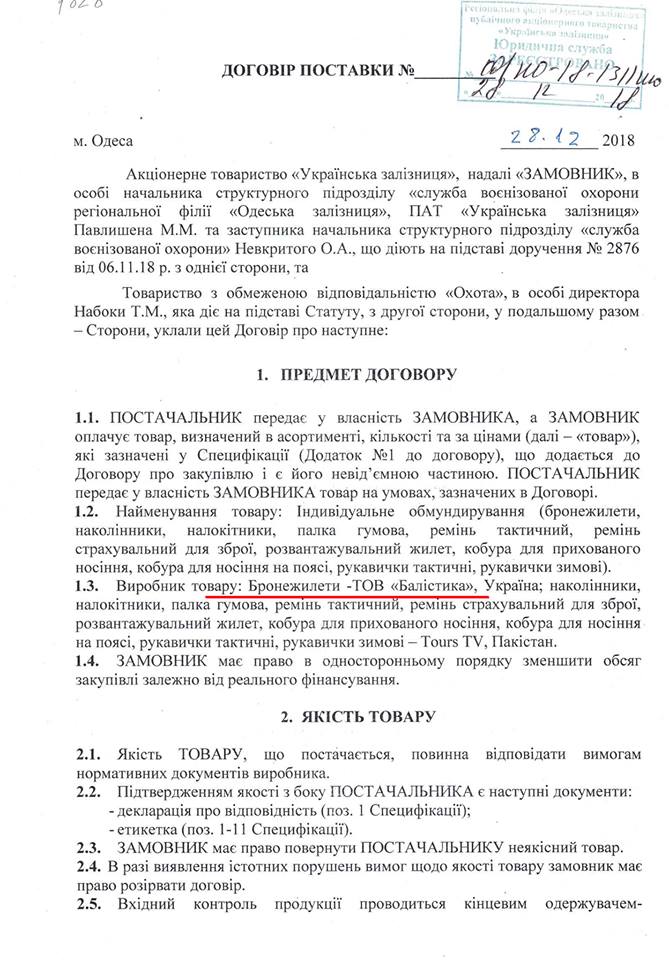Региональный филиал "Одесская железная дорога" АО "Укрзализныця" подписала договор с ООО "Охота" на поставку бронежилетов производства ООО "Баллистика" на сумму 462 тысяч гривен, однако производитель заявил, что не продавал никакой продукции подрядчику. Об этом сообщает "Залізниця без корупції".