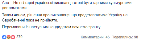 "Таким образом, решение об исполнителе, который будет представлять Украину на Евровидении, пока не принято. Переговоры с последующим кандидатом начнем утром (во вторник, 26 февраля)", - сообщил он.