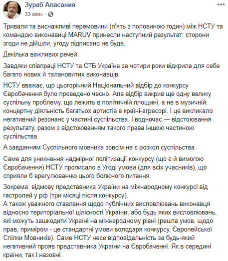 В свою очередь председатель правления НОТУ Зураб Аласания на своей странице в соцсети Facebook заявил, что именно привело к неподписанию договора: "Во избежание чрезмерной политизации конкурса (что является требованием Евровидения) НОТУ прописало в соглашении условия (для всех участников), которые способствовали бы урегулированию этого болезненного вопроса. В частности: отказ представителя Украины на международном конкурсе от гастролей в РФ (три месяца после конкурса). А также внимательное отношение к публичным высказываниям исполнителя относительно территориальной целостности Украины, или какие-либо высказывания, которые могут навредить Украине на международном уровне (остальные условия, относительно прав, к примеру – это стандартные условия обладателя конкурса, Европейского Союза вещателей). Именно НОТУ несет ответственность за любое негативное проявление представителя Украины на Евровидении. Как внутри страны, так и вне", - написал Аласания. Вместе с тем он отметил, что "не все украинские исполнители готовы быть хорошими культурными дипломатами".