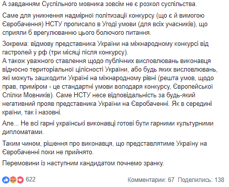 По словам Аласании, решение об исполнителе, который будет представлять Украину на Евровидении, пока не принято. Переговоры с кандидатом начнут утром 26 февраля.