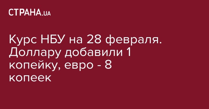 Также регулятор повысил курс евро на 8 копеек до 30,73 гривен за евро. Официальный курс евро на 28 февраля установлен на уровне 3073,3961 гривни за 100 евро (+7,8997 грн).