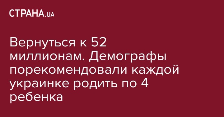 Для того, чтобы в Украине стало снова 52 миллиона жителей (население Украины в 1994 году - прим. ред.) каждая украинка, включая жителей оккупированных территорий и Крыма, должна родить не меньше четырех детей. Об этом говорится в сюжете ТСН.