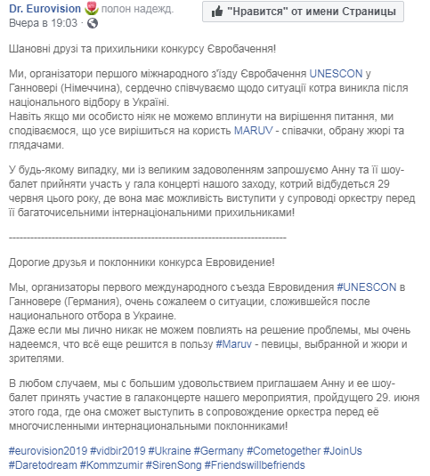 Мы, организаторы первого международного съезда Евровидения #UNESCON в Ганновере (Германия), очень сожалеем о ситуации, сложившейся после национального отбора в Украине.