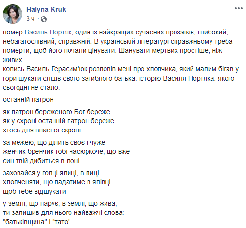 "Умер Василий Портяк, один из лучших современных прозаиков, глубокий, немногословный, настоящий. В украинской литературе настоящему нужно умереть, чтобы его ценить. Уважать мертвых проще, чем живых", - написала поэтесса Галина Крук.