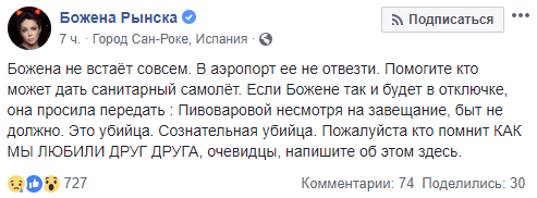 "Божена не встает совсем. В аэропорт ее не отвезти. Помогите, кто может дать санитарный самолет...", - пишут друзья журналистки с ее же аккаунта в соцсети. Знакомые и коллеги журналистки в полном замешательстве: они планируют объявить сбор средств. Также коллеги переживают о судьбе домашних животных Божены, которых также необходимо перевезти из Испании в Россию.