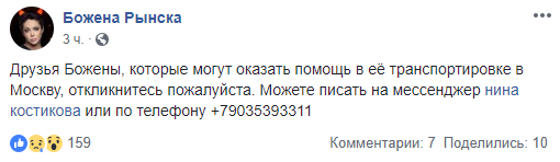 Несколько дней до этих событий Божена сообщила, что боится возвращаться в Москву из Испании, опасаясь травли людей. "Я виновата, не долюбила. Не долетела за ним", - писала она.