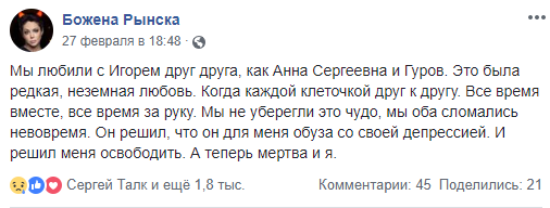 По ее постам можно судить о том, как тяжело женщина переживает смерть Игоря Малашенко. Она винит себя в его смерти. "Мы любили с Игорем друг друга, как Анна Сергеевна и Гуров. Это была редкая, неземная любовь. Когда каждой клеточкой друг к другу. Все время вместе, все время за руку. Мы не уберегли это чудо, мы оба сломались невовремя. Он решил, что он для меня обуза со своей депрессией. И решил меня освободить. А теперь мертва и я", - написала она 27 февраля.