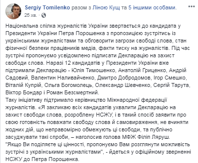 "Я призываю всех кандидатов принять Декларацию в защиту свободы слова, разработанную НСЖУ, и таким образом заявить о своей готовности уважать свободу слова и самовыражения, не совершать никаких действий, неправомерно ограничивающих эти свободы и публично осуждать такие попытки", - подчеркнул глава МФЖ Филипп Ляруш.