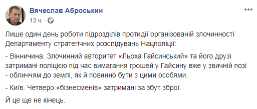 Об этом на своей странице в Facebook сообщил первый заместитель председателя Нацполиции Вячеслав Аброськин.