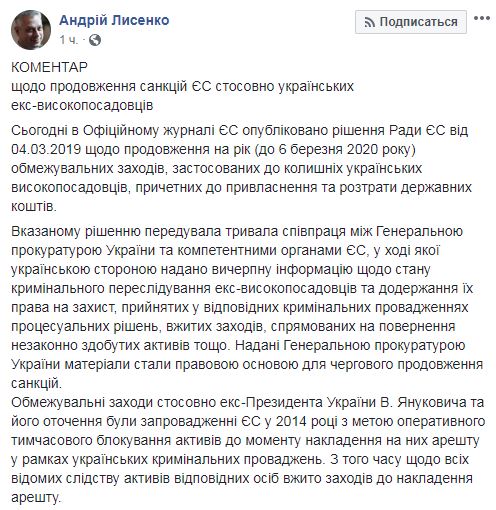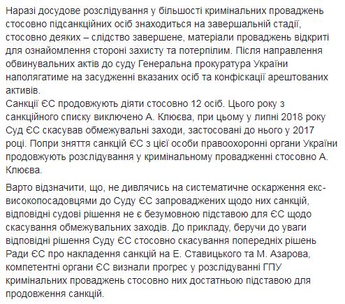 Как отметил при этом Лысенко, несмотря на систематическое обжалование экс-чиновниками в Суде ЕС введенных в отношении них санкций, соответствующие судебные решения не являются безусловным основанием для ЕС об отмене ограничительных мер. "Например, принимая во внимание соответствующие решения Суда ЕС об отмене предыдущих решений Совета ЕС о наложении санкций на (экс-министра энергетики времен президентства Януковича - прим. Рред.) Эдуарда Ставицкого и (экс-премьера Украины времен президентства Януковича – прим. ред.) Николая Азарова, компетентные органы ЕС признали прогресс в расследовании ГПУ уголовных производств в отношении них достаточным основанием для продолжения санкций", - написал спикер Генпрокуратуры.