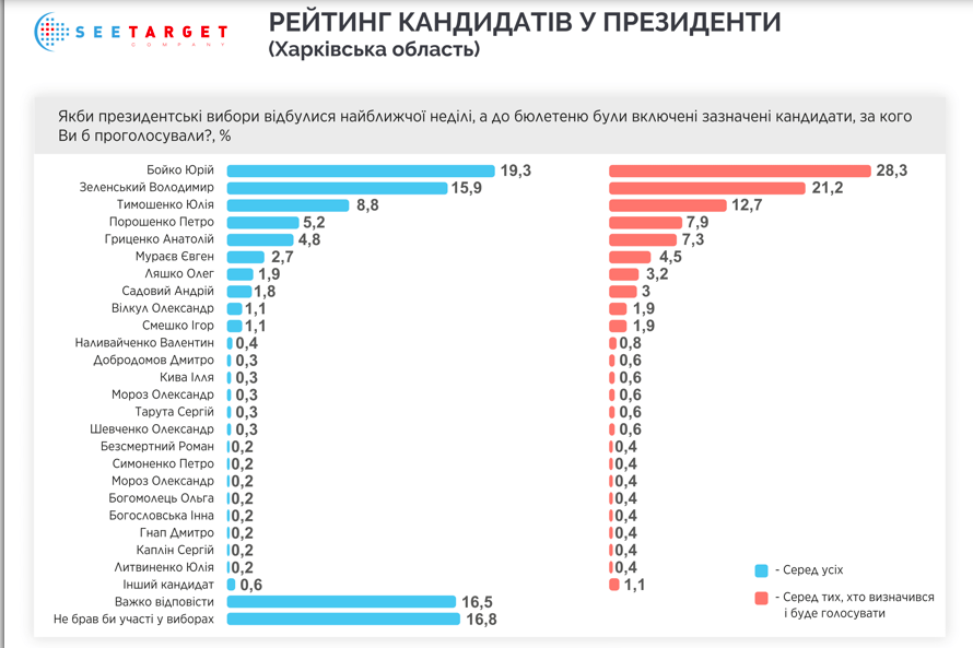 В тройки лидеров президентской гонки согласно опросу украинцев в Харьковской области, которые определились и будут голосовать, вошли Юрий Бойко с 28,3%, Владимир Зеленский (21,2%) и Юлия Тимошенко - (12,7%).