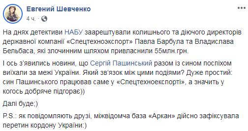 "На днях детективы НАБУ арестовали бывшего и действующего директоров государственной компании "Спецтехноэкспорт" Павла Барбула и Владислава Бельбаса, которые преступным путем присвоили 55 млн. грн. И вот появились новости, Сергей Пашинский вместе с сыном спешно выехали за пределы Украины. Связь между этими событиями? Очень простая: сын Пашинского работал именно в "Спецтехноэкспорте", а значит у кого-то сильно подгорает. Сообщают друзья, межведомственная база "Аркан" действительно зафиксировала пересечение границы Украины", - написал он.