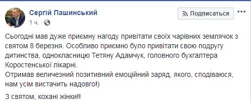 "Сегодня имел очень приятную возможность поздравить своих очаровательных землячек с праздником 8 марта. Особенно приятно было поздравить свою подругу детства, одноклассницу Татьяну Адамчук, главного бухгалтера Коростенской больнице. Получил огромный положительный эмоциональный заряд, которого, надеюсь, нам всем хватит надолго!)", - написал Пашинский.