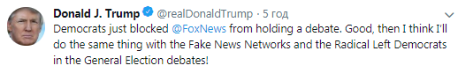 "Демократы отказали Fox News от проведения внутрипартийных дебатов. Хорошо, тогда я думаю, что сделаю то же самое с лживыми новостными телекомпаниями и радикальными левыми демократами в вопросе дебатов на всеобщих выборах!" - написал Трамп.