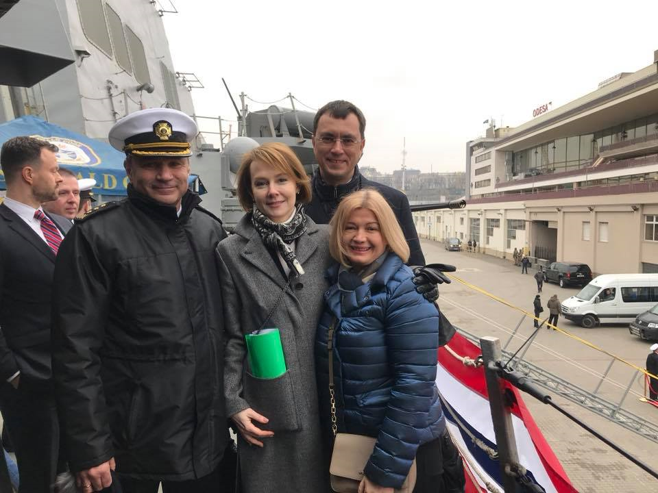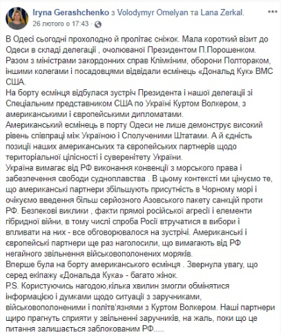 Однако 26 февраля Геращенко посетила Одессу в составе делегации во главе с президентом Петром Порошенко, где на борту эсминца ВМС США "Дональд Кук" чиновники провели встречу с американскими и европейскими дипломатами. Об этом Геращенко написала на своей странице в Facebook.