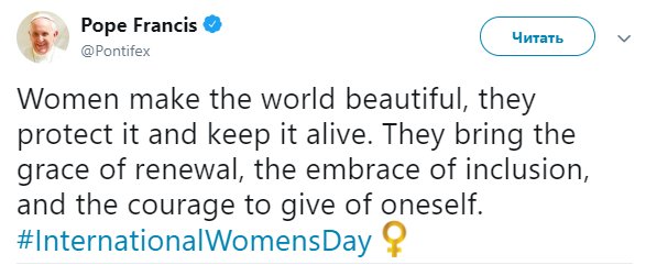 "Женщины – это те, кто украшает этот мир, хранят и поддерживают жизнь. Они несут обновление, тепло объятий и вдохновляют на самоотдачу", – написал Франциск, добавив к своей публикации хештег "Международный женский день".