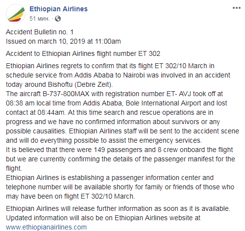 Самолет разбился возле эфиопского города Дэбрэ-Зэйт утром 10 марта. В настоящее время ведутся поисково-спасательные работы. Информации о выживших или числе жертв пока нет.