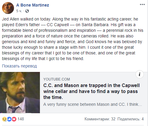 "Джед Аллан ушел сегодня. В своей фантастической актерской карьере он играл отца Идена - CC Capwell - в Санта-Барбаре. Его дар представлял собой грозную смесь профессионализма и вдохновения... Он также был щедрым, добрым, веселым и жестоким, и, Бог знает, как его любили те, кому посчастливилось разделить с ним сцену. Я считаю знакомство с ним это одним из величайших благословений в моей карьере и жизни, которое я получил, чтобы стать его другом", - написал Мартинес.