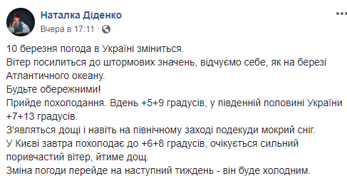 В Украине с понедельника, 11 марта погода существенно изменится. Как сообщила в Facebook народный синоптик Наталья Диденко украинцев ждет похолодание.