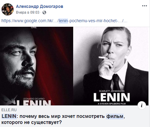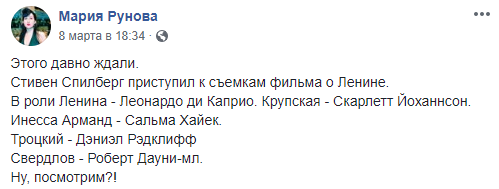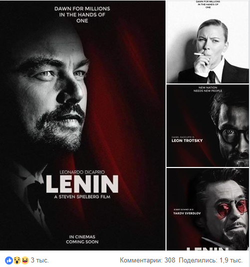 В соцсетях в очередной раз запустили фейк про съемки загадочного фильма Стивена Спилберга о Ленине в ролях с Леонардо Ди Каприо в роли вождя и Скарлетт Йоханссон в роли Надежды Крупской. Впрочем, несмотря на явный интерес к картине, ее не существует в природе.