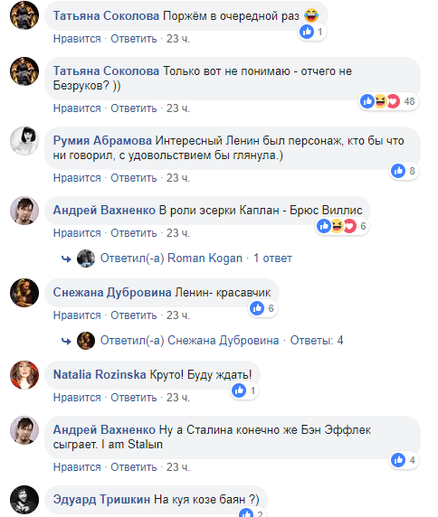 Автор интернет-шутки был убедительным. Он заявил, что в картине приняли участие и другие голливудские звезды: Дэниэл Рэдклифф в роли Льва Троцкого, Роберт Дауни-младший - Якова Свердлова, Франсуа Арно перевоплотился в Иосифа Сталина, а Сальма Хайек - в Инессу Арманд. "Не актерский состав, а настоящее собрание ЦК КПСС", - писали пользователи соцсети.