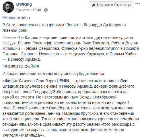 Описание фильма также выглядело правдоподобно: "Фильм Стивена Спилберга LENIN - трагическая история любви Владимира Ульянова Ленина и Инессы Арманд, дочери французского оперного певца Теодора д’Эрбенвилля, продолжавшаяся почти до самой ее смерти. По некоторым данным Вождь Октябрьской социалистической революции не вынес потери и скончался через 4 года. В новой киноленте Спилберга, по мнению критиков, умышленно занижается роль жены Ленина, Надежды Крупской, в его становлении как революционера. Также крайне мало внимания уделено их семейным отношения".