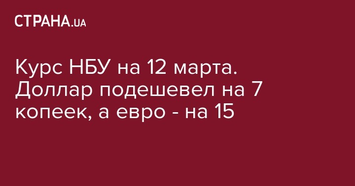 Во вторник, 12 марта, Национальный банк Украины (НБУ) установил официальный курс основных валют по отношению к гривне. По сравнению с предыдущим банковским днем доллар подешевел на 7 копеек. Об этом свидетельствуют данные, размещенные на сайте регулятора.