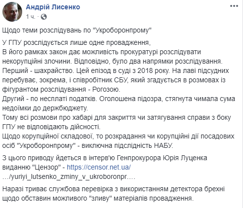 Что касается коррупционной составляющей, то Лысенко отмечает, что хищение или коррупционные действия должностных лиц "Укроборонпрома" - исключительно подследственность НАБУ. "Сейчас продолжается служебная проверка с использованием детектора лжи относительно обстоятельств возможного "слива" материалов производства", - резюмирует он.