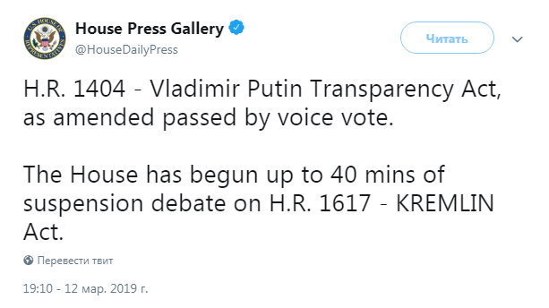 Палата представителей Конгресса США проголосовала за законопроекты, направленные против России вообще, и в том числе против президента Владимира Путина в частности. Об этом сообщает пресс-служба Палаты представителей США в Twitter.