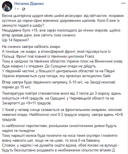 В четверг, 14 марта, в Украине будет господствовать атмосферный фронт из Польши, который связан с северным циклоном Franz. Поэтому в западных и северных областях Украины, а также в Винницкой области прогнозируют облачную погоду с осадками. Об этом сообщает синоптик Наталья Диденко в Facebook.