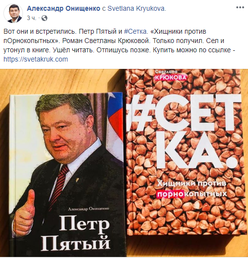 "Вот они и встретились. Петр Пятый и #Сетка. "Хищники против пОрнокопытных". Роман Светланы Крюковой. Только получил. Сел и утонул в книге. Ушёл читать. Отпишусь позже. Купить можно по ссылке - https://svetakruk.com", - написал Александр Онищенко.
