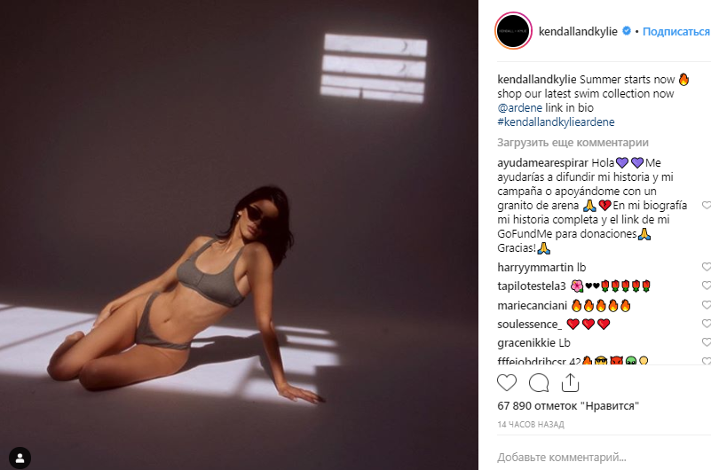 На фото 23-летняя Дженнер, которую британский телеведущий Пирс Морган называети единственной красивой женщиной в семье Кардашьян, позирует на полу в студии с приглушенным светом. На девушке - солнечные очки и серое бикини из новой коллекции Kendall + Kylie.