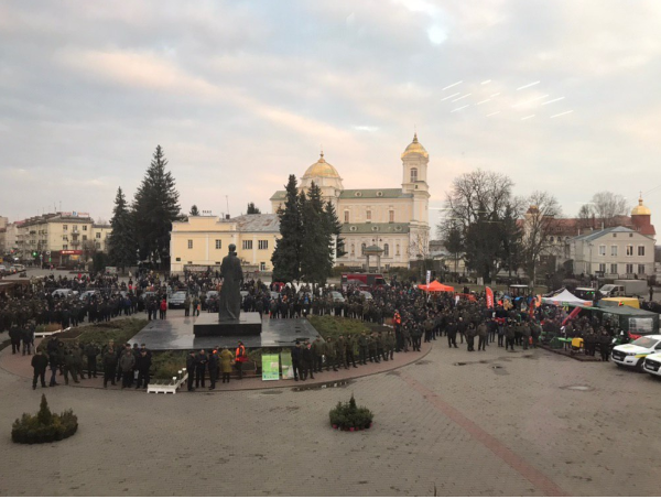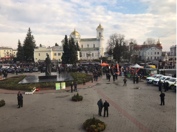 15:28 Вся территория перед театром в Луцке огорожена забором, за которым стоит до сотни митингующих людей.
