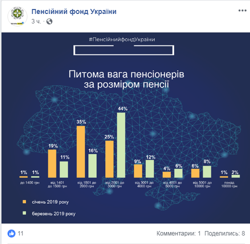По состоянию на 1 марта 2019 года, уже после повышения пенсий, большинство граждан Украины получают выплаты до 3 тыс. грн.  Об этом сообщает пресс-служба Пенсионного фонда Украины.