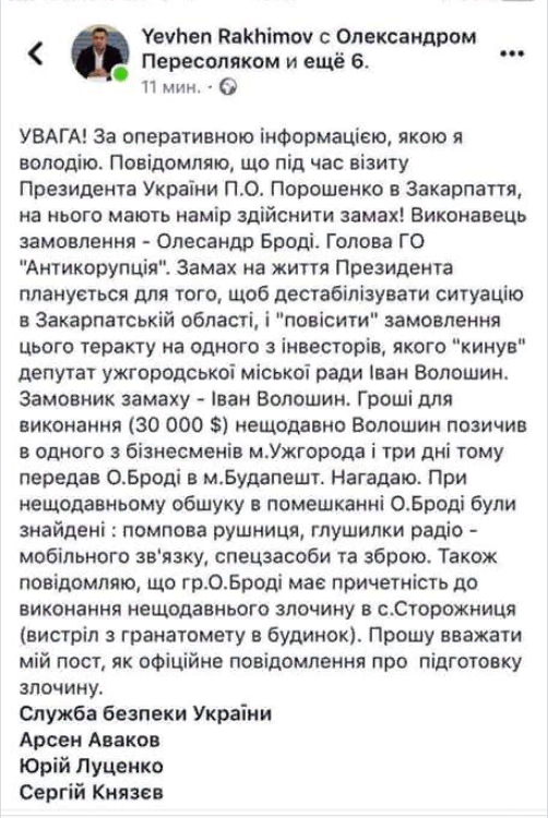 "Прошу считать мой пост, как официальное сообщением о готовящемся преступлении. Во время визита Порошенко в Закарпатье на него намерены совершить покушение", - написал он. Свое сообщение Рахимов оставил в официальной группе Ужгорода в Facebook, однако позже оно было удалено - в том числе и со страницы самого Рахимова.