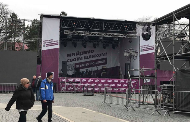 15:47 Возможно, президент сегодня выступит в Ужгороде. По крайней мере, там смонтировали сцену с предвыборными слоганами Петра Порошенко.